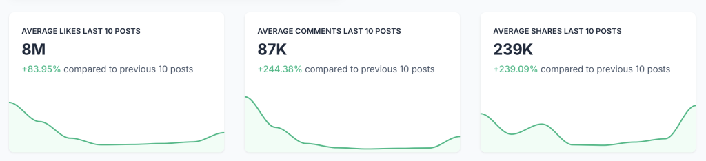 Each card also shows a percentage change compared to the previous 10 posts, so you can see if engagement is improving or declining.