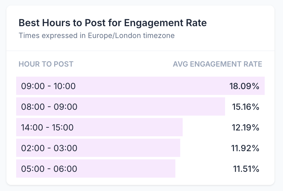 This section shows the hours when this profile’s videos have historically performed best. Times are displayed in your selected timezone. Use this to schedule posts when the audience is most active.