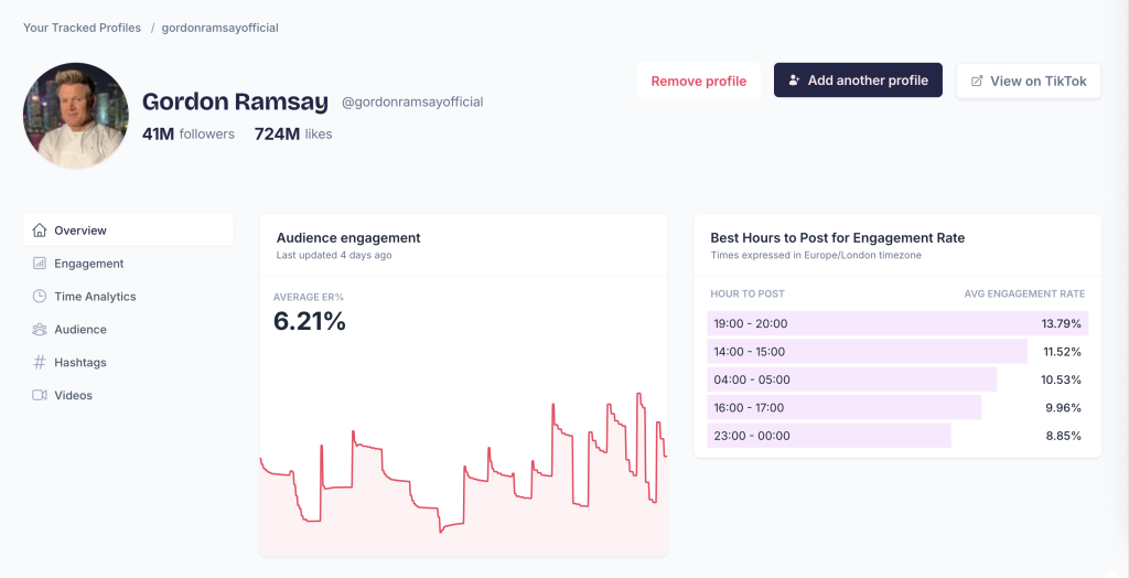 At the bottom, you’ll find the profile’s most recent videos and their top-performing videos by engagement.